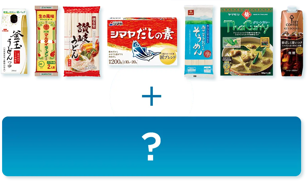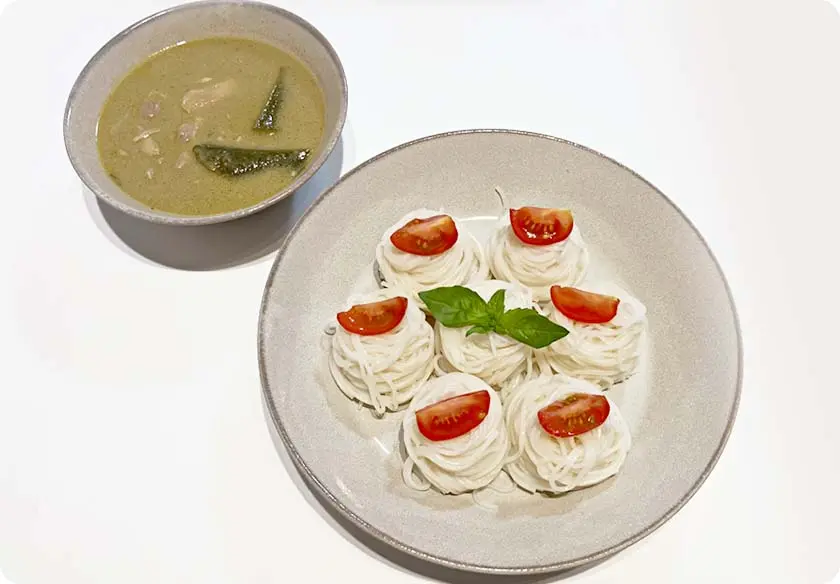 - ④ 卵黄、キムチ、刻みねぎ、刻みのり、肉味噌をのせ、釜玉うどんつゆをかけます。